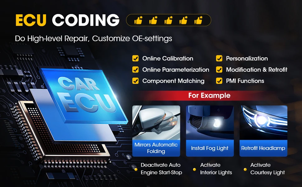 Beyond the strong professionalism of most competitors, LAUNCH scanner features advanced online coding for BMW, MIMI, Citroen, Renault, Au~di, VW, Benz, etc., allowing you to replace/recode new modules without any hassle. As to offline coding,LAUNCH scan toollevels up personalized settings to flash auto start-stop, folding mirrors, interior lights; retrofitting new fog lights/TPMS for new enjoyment; modifying values to get more hidden functions, etc.